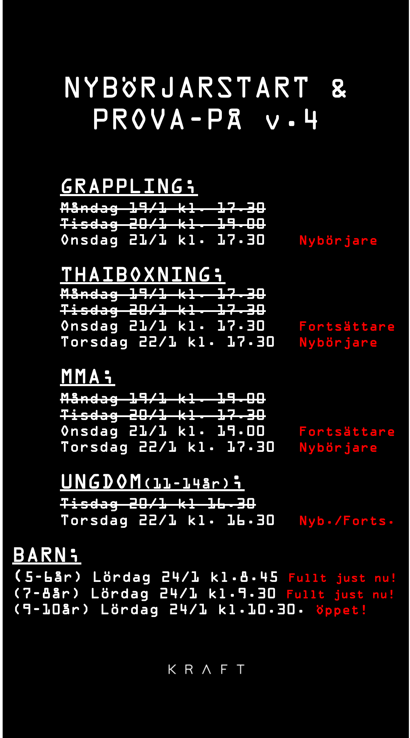 Inför kommande terminsstart har vi följande schema för Provträning under vecka 4. Du är välkommen att prova träningen Gratis vid ett tillfälle!